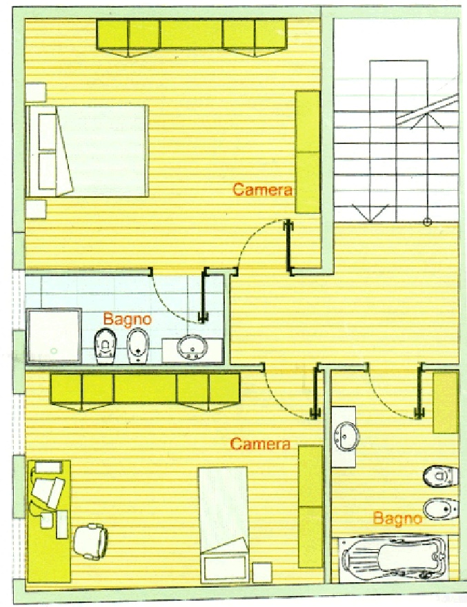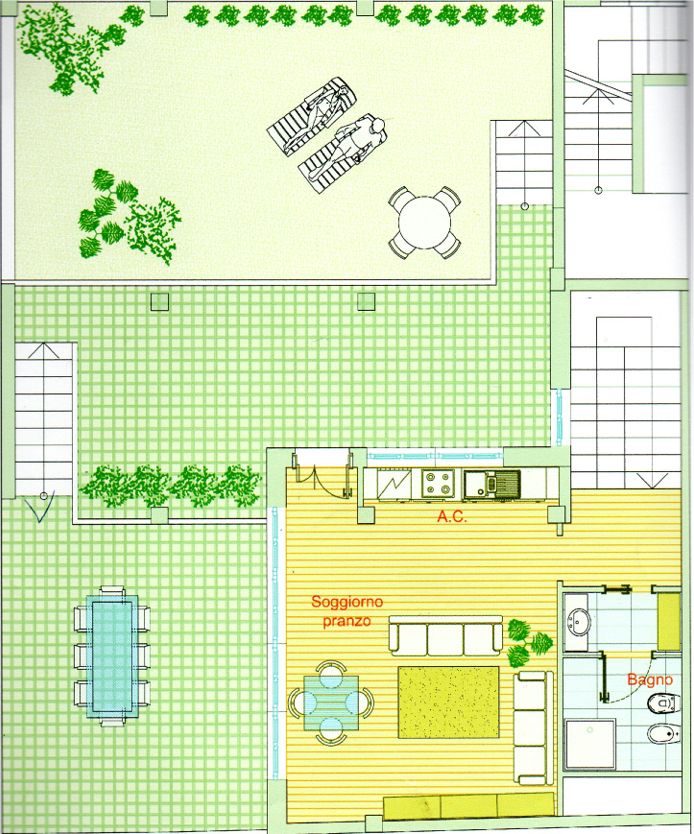 appartamento su 2 piani con ampi patii esterni coperti, giardino.